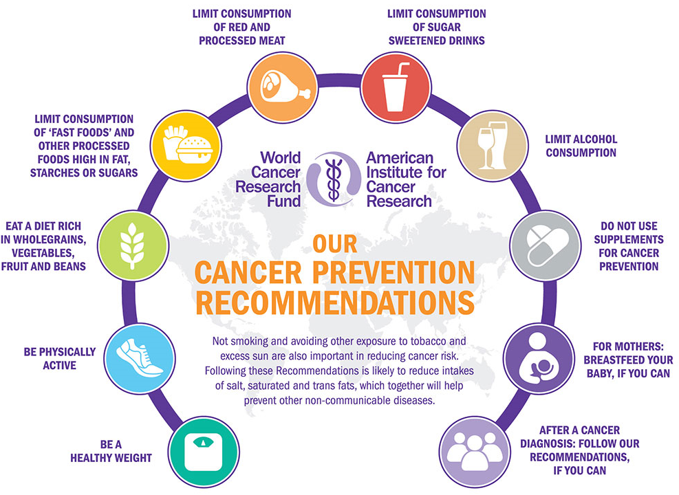 L’alimentazione gioca un ruolo fondamentale non soltanto durante le terapie ma anche in termini di prevenzione oncologica, le 10 raccomandazioni formulate dal World Cancer Research Fund (WCRF) riassumono le evidenze scientifiche presenti in letteratura.